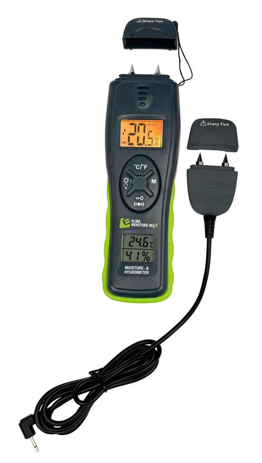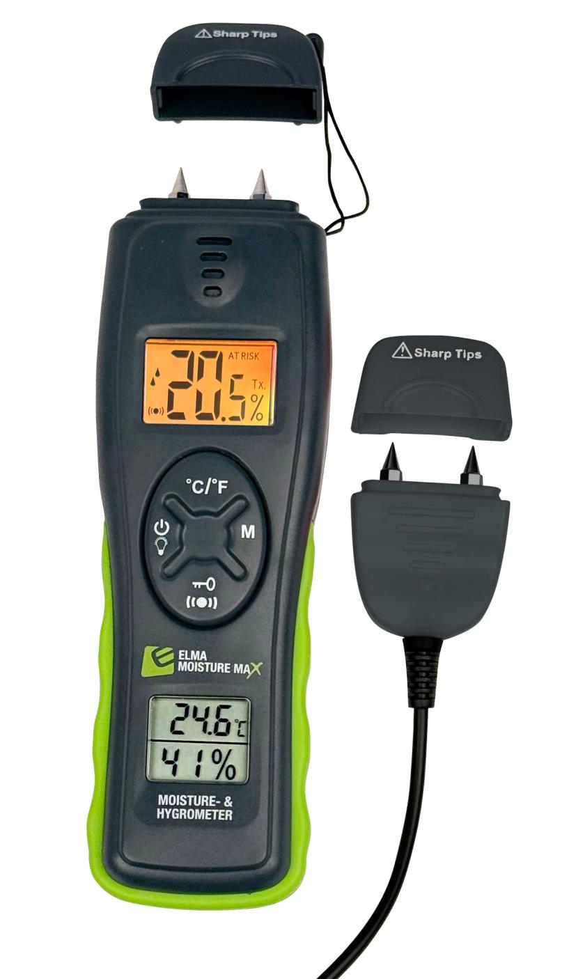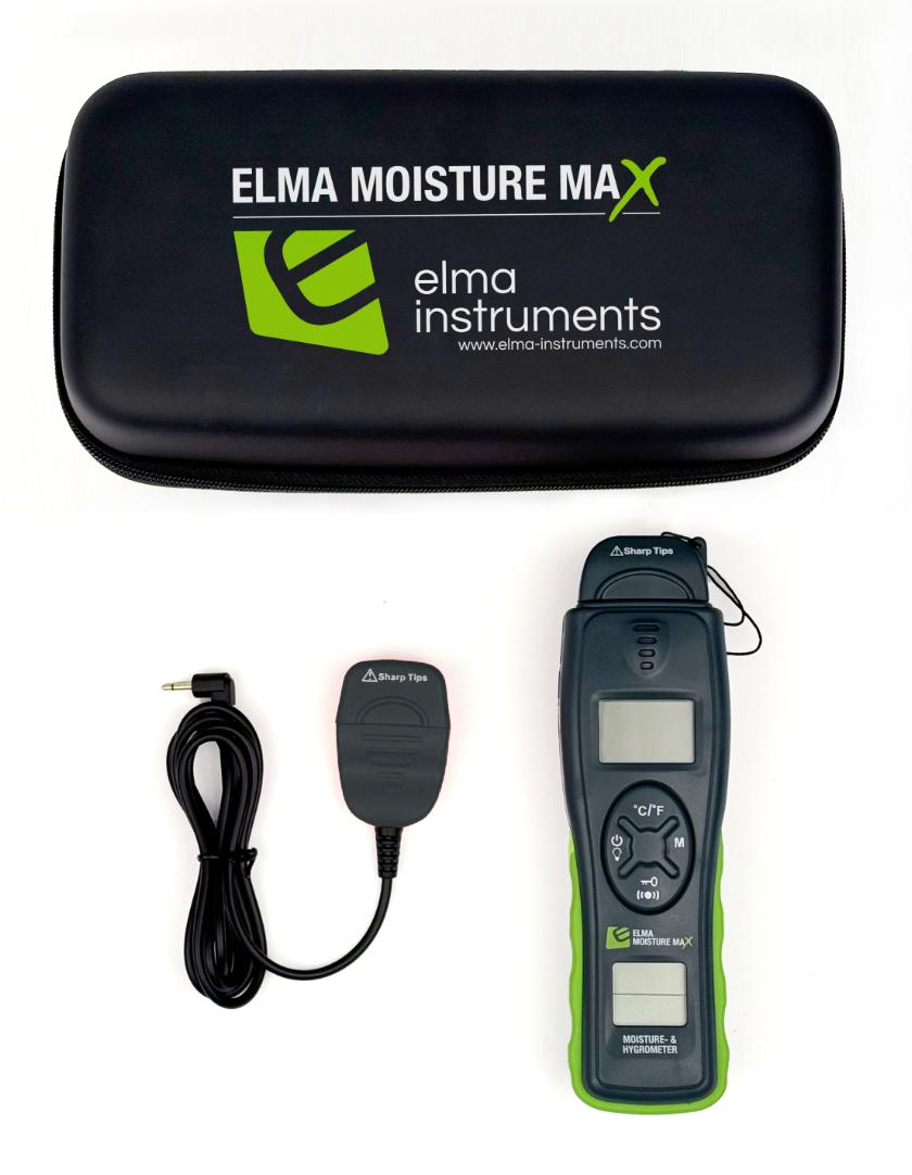 Elma Moisture Max är en professionell digital fuktmätare för snabb och noggrann mätning av fukt i trä, byggmaterial, väggar, tak och golv. Instrumentet kombinerar icke-destruktiv fuktsökning med stiftmätning, vilket gör det enkelt att lokalisera fuktproblem och därefter dokumentera dem korrekt.