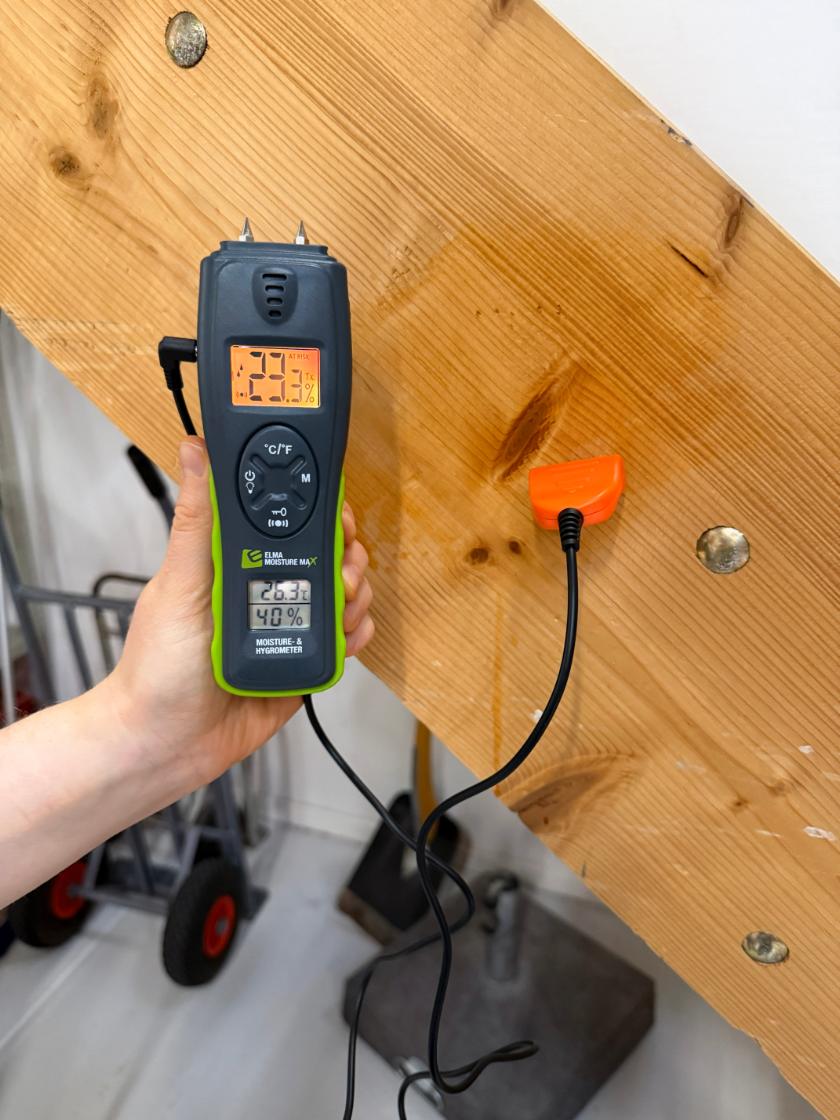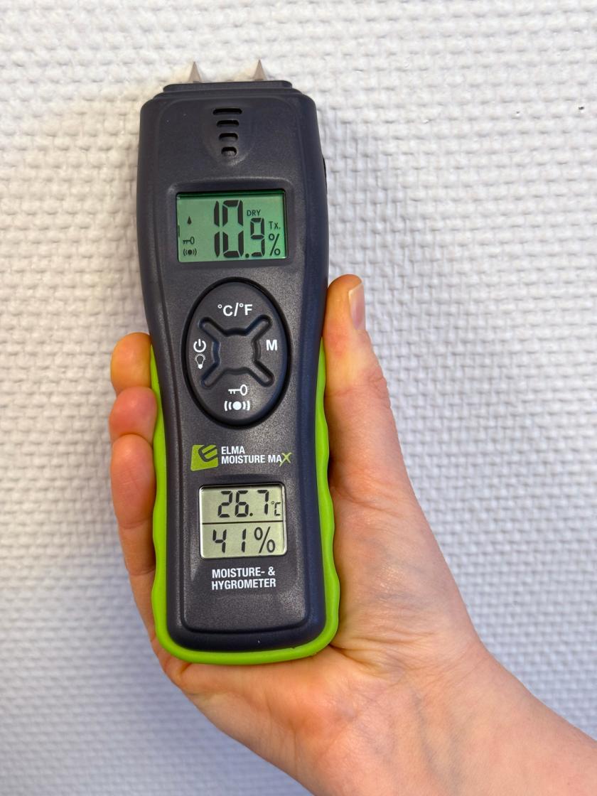 Den inbyggda högfrekventa skannern gör det möjligt att kontrollera större ytor utan att skada materialet, medan instickselektroderna ger exakt fuktmätning i trä (%MC). Samtidigt mäter Elma Moisture Max temperatur och relativ luftfuktighet, vilket gör instrumentet idealiskt för inomhusklimat, byggtekniska kontroller och skadeservice.
