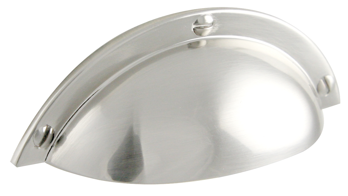 Skålformat handtag med präglade skruvar på handtagets utsida. Handtaget monteras genom skruvar på handtagets baksida.