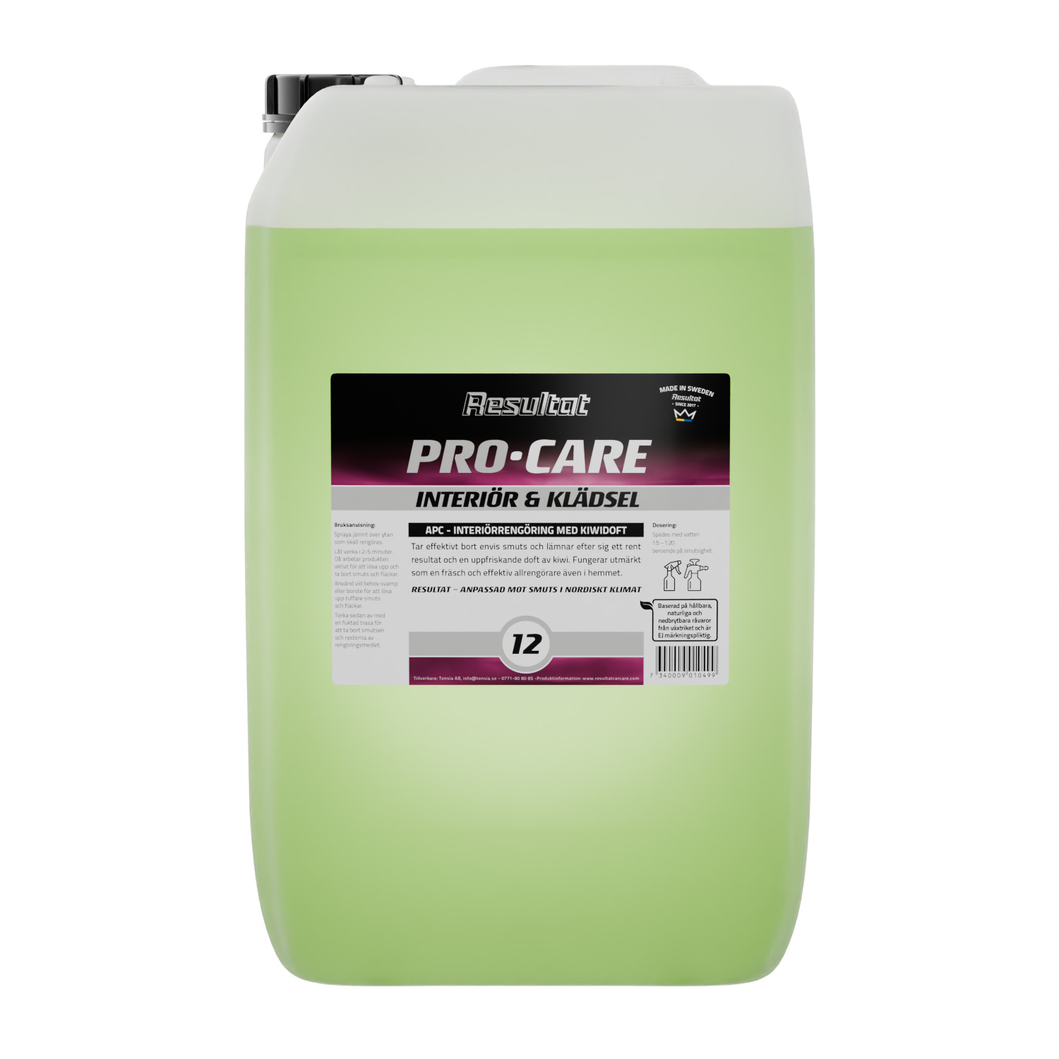 Produkten är baserad på naturliga och nedbrytbara råvaror FRÅN VÄXTRIKERT och är EJ märkningspliktig. Effektiv och högkoncentrerad alkalisk rengöring med kiwi doft för fordon invändigt. Rengör plast, gummi, vinyl och glas. Fungerar utmärkt till klädseltvätt, för både skinn och textil. Löser effektivt upp smuts och lämnar torr och ren yta.