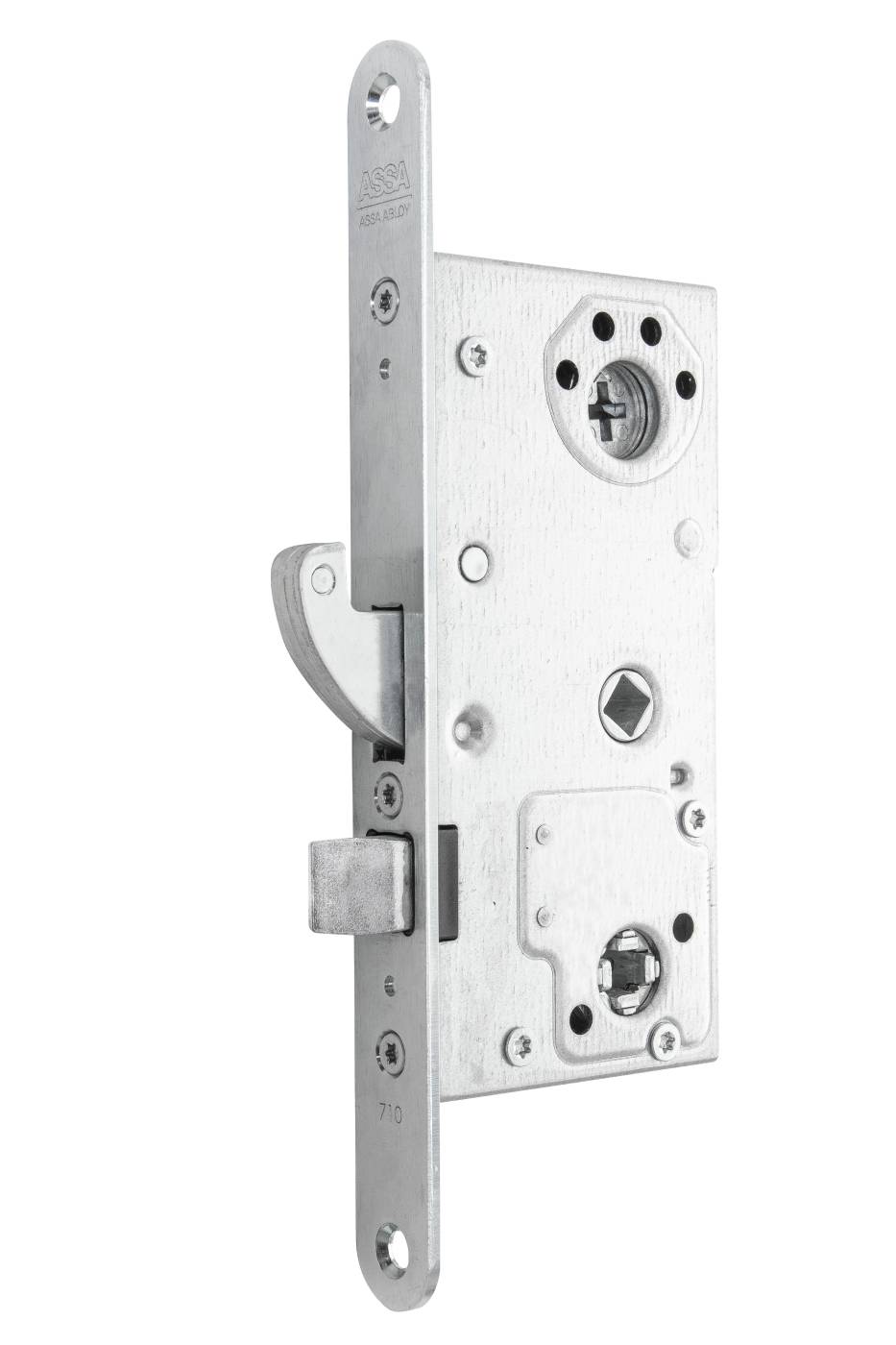 Låshus för nödutrymningsbeslag Assa 179. 710 med hakregel och tryckesfall. 711 med hakregel. Möjlighet till återinrymning via utvändigt trycke. Tryckesfall ger brandigenhållning. Kan kombineras med elslutbleck STEP 18/28. Kan erhållas med mikrobrytare ME för indikering av låst/olåst hakregel samt indikering vid användning av utrymningshandtaget. Möjlighet till behörig nyckelpassage via cylinder. 710 avsett för behör 179 A. 711 avsett för 179 B.