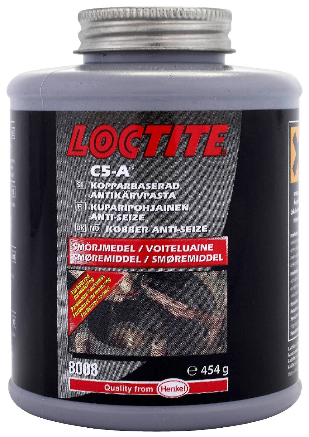 LB 8007, 8008, 8065 Kopparbaserad antikärvpasta. Typiska applikationer: skruvar, muttrar, rör, bultar på avgassystem, bromsoksbultar. LOCTITE LB 8007 – sprayflaska. LOCTITE LB 8008 – penselburk. Exklusiv sammansättning med fördelat koppar och grafit i ett fett av hög kvalitet. Skyddar metalldelar mot rost, korrosion, kallsvetsning och kärvning vid temperaturer upp till 980 °C.