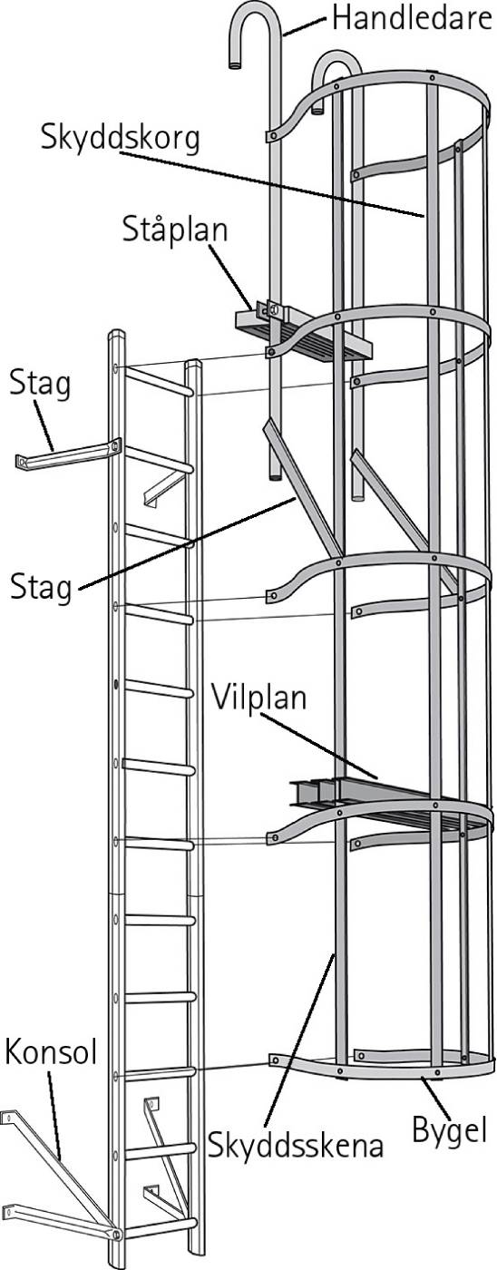 Skyddskorgen består av byglar och skyddsskenor. Stegen måste kompletteras med handledare 1,0 m för infästning av skyddskorg. Handledare: Handledare av stål fzv. Monteras enkelt i väggstenens topp. (Ståplan kan monteras på handledarna). Stag för skyddskorg: Stag av stål fzv. Monteras för att fixera bygeln i horisontalläge. Största avstånd mellan stagen max 12 m. Vilplan aluminium: Monteras på bygel i skyddskorgen. Viks enkelt upp vid passage. Stag för skyddskorg monteras på bygeln ovanför vilplanet. Ståplan stål fzv: Ståplan av stål fzv. Monteras på handledare för att underlätta övergången mellan väggstege och takstege. Ytan är 450×190 mm. Ledstång: Montera mellan vägg och takstege. Längden på teleskopdelen anpassas till taklutningen. Kapning och borrning av övre hålet i teleskopdelen göres på plats.