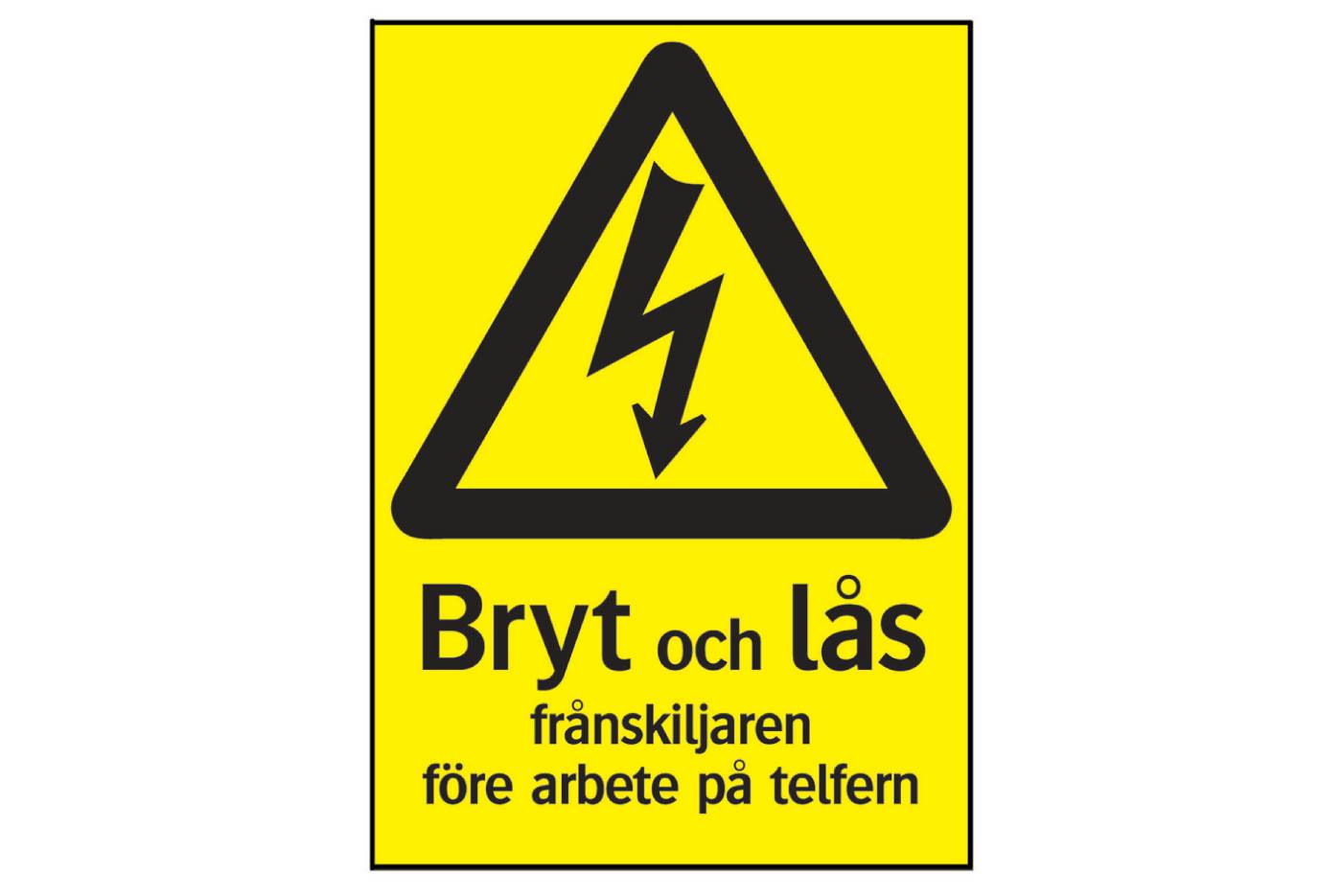 skylt 331114 varning el bry och lås före telfern 210x297mm Varningsskylt Bryt och lås frånskiljaren före arbete med telefon