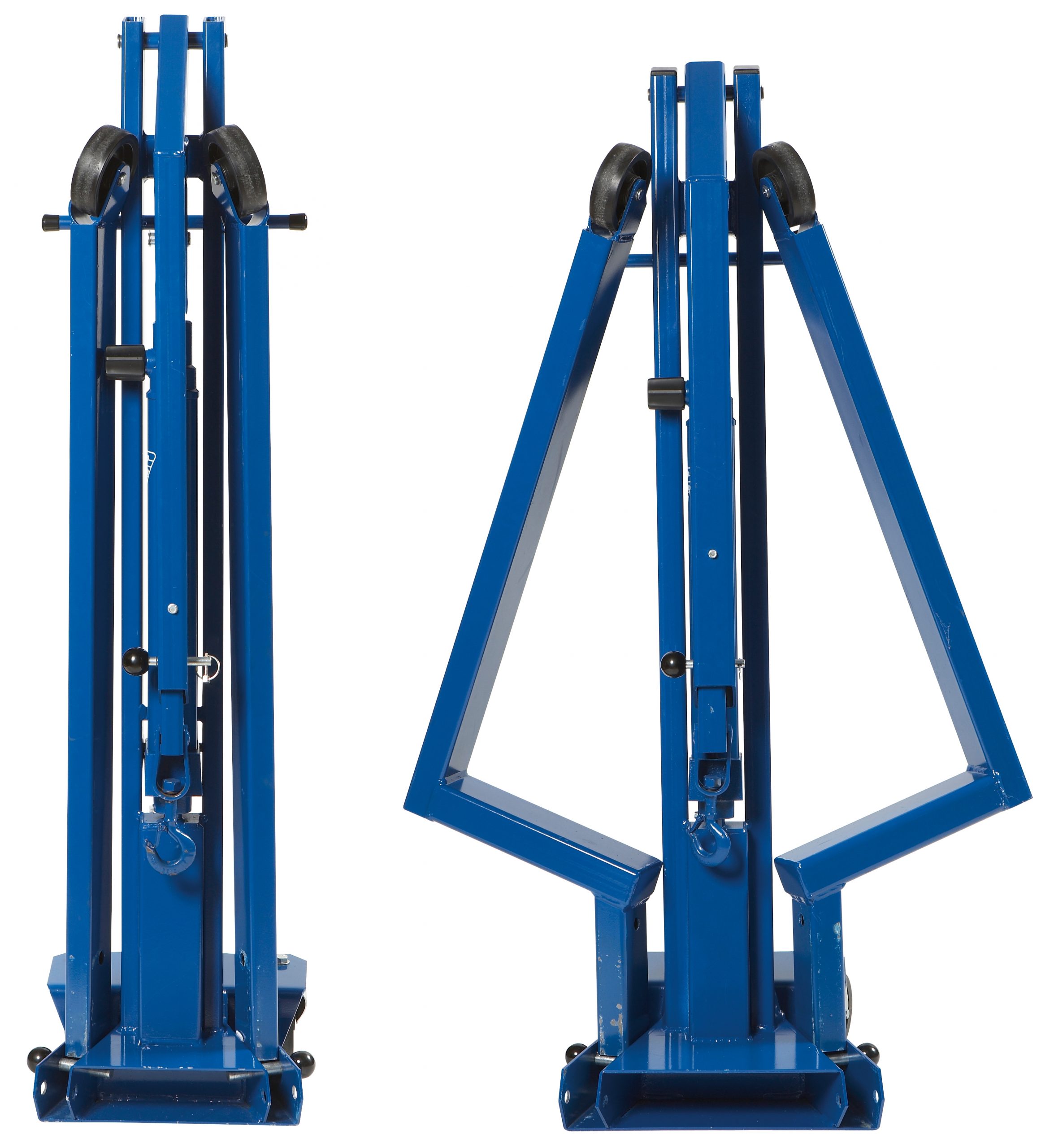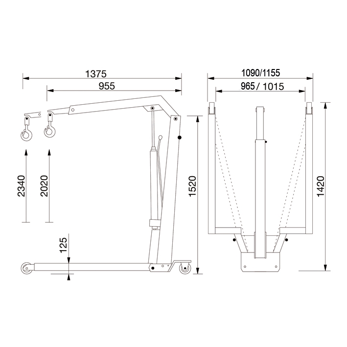 Kan fällas ihop på några få sekunder för snabb och enkel förvaring. Hopfälld kräver kranen minimalt med plats på verkstadsgolvet. Utdragsarm med stor lyftkapacitet, även i det yttersta läget. (*Se kapacitetsöversikt). Hårdförkromad kolvstång och pumpkolv säkrar lång livstid. Inbyggd säkerhetsventil skyddar mot överbelastning. 360° svängbara bakhjul säkerställer att kranen är manöverduglig även med full belastning. Utrustad med 360° vridbar krok. Handmanövrerat dödmansgrepp ger optimal säkerhet vid sänkning.